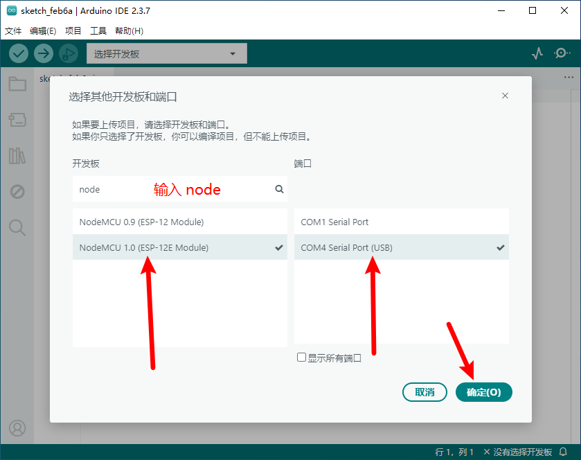 然后会进入一个选择页面,在 开发板 的搜索框中搜索 node,选择1.0的版本,端口就是刚刚的那个,点击 确定。